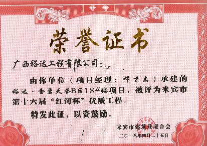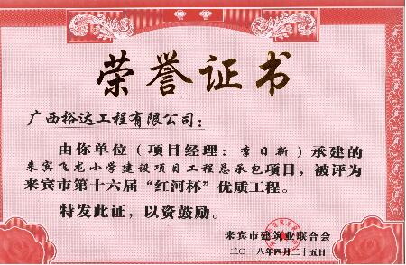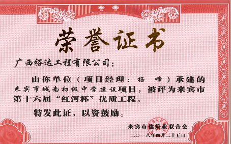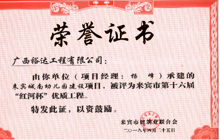 近期,从来宾市建筑业联合会传来喜讯,KY开元承建的“来宾城南幼儿园建设项目”“来宾市城南初级中学建设项目”“来宾飞龙小学建设项目工程总承包”“裕达·金碧天誉B区17#楼”和“裕达·金碧天誉B区18#楼”共5项工程项目被评为来宾市第十六届“红河杯”优质工程,这是继2011年至2017年荣获的25项“红河杯”优质工程之后,再获此荣誉。