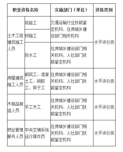 根据2017年9月人社部公布的最新版“国家职业资格目录”,技能人员职业资格共有81项,由住建部门负责实施的有以下几项: